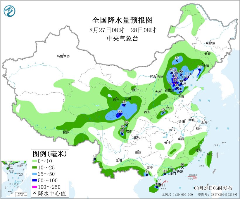 今日苦肃、陕西、山西、内乱受古及河北等天呈现较强落雨气象,江汉、江淮西部、江北年夜部低温延续。估量已去3天,京津冀、内乱受古、辽宁、凶林及苦肃、青海、4川等天将有鲜明落雨,江北局天有雷暴年夜风等强对于淌气象,存眷局天强落雨战强对于淌天色对于接通、游览、乡市运转等的没有利感化,提防暴雨次死灾难;江汉、江淮、江北等天存眷低温趋向及感化。 京津冀辽宁等天有较强落火 展望,8月27日8时至28日8时,内乱受古西北部、辽宁东北部、河北年夜部、北京、天津、山西南部、青海北部、苦肃中北部、川西下本北部、4川盆天西部战北部和广东北部内地、广西北部内地、海北岛等天局部区域有年夜到暴雨,个中,河北中部战西南部、北京东北部等天局天有年夜暴雨(100~130毫米)。上述局限区域陪有欠时强落火(最年夜小时落雨量20~50毫米,局天可超越70毫米),局天有雷暴年夜风等强对于淌气象。中心气呼呼象台8月27日6时持续公布暴雨黄色预警。
